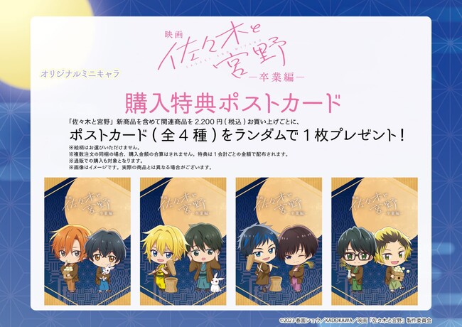 映画『佐々木と宮野─卒業編─』の新作グッズを含む関連商品を、2,200円(税込)お買い上げごとにポストカード(全4種)をランダムで1枚プレゼント! オリジナルミニキャライラストを使用しているので、全部集めて飾りたくなります……。