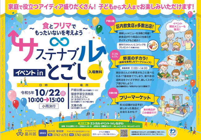 品川区は10月22日、戸越公園(品川区豊町2-1)と環境学習交流施設「エコルとごし」(戸越公園内)、文庫の森(豊町1-16)3会場で「サステナブルイベントinとごし~食とフリマでもったいないを考えよう~」を開催します。
