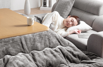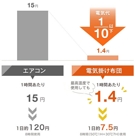 本製品は最高温度で使用しても1時間当たり1.4円の電気代でご使用いただくことができます。一般的にエアコンの暖房を1時間使った場合の平均は約15円となり、1日8時間使う場合の1か月の電気代の差は3000円以上にもなります。「もはや、こたつ。 電気掛け布団」を活用することで寒い冬でも暖かくお休みいただくことができ、さらに電気代を節約することも可能です。