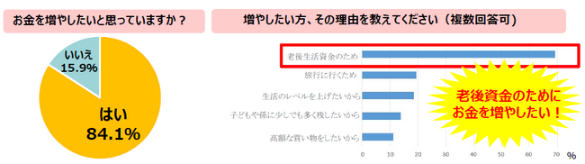 今回のアンケートで「お金を増やしたいと思っていますか?」という質問では、84.1%の60代女性が「はい」と回答。その理由として、「老後生活の資金のため」が69.4%、「旅行へ行くため」が19.4%、「生活のレベルを上げたいから」が18.5%、「子どもや孫に少しでも多く残したいから」が13.9%と続き、子どもや孫のためではなく、自分のためにお金を増やしたいと考えている60代女性が多いことがわかりました。