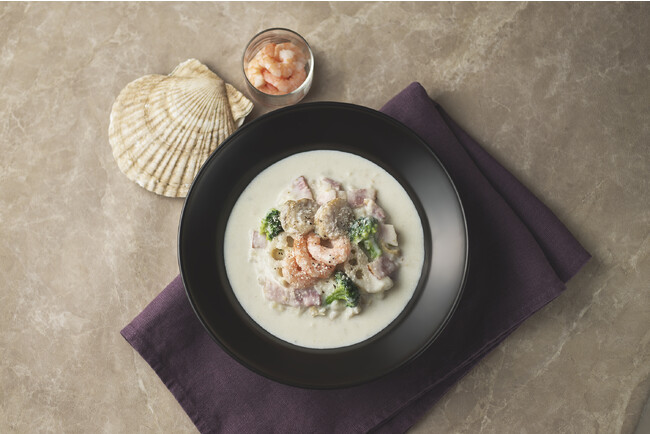 6.5 CROSSTIES COFFEE/リゾット風スープごはん~北海道産帆立を使ったシーフードチャウダー~/880円/使用海産物:帆立/寒い季節にぴったりのシーフードチャウダーを使ったリゾット風のスープごはん。 北海道産の帆立を使用し、海老・ベーコンをトッピングしました。