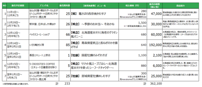 1.そば店舗、カフェ、おむすび専門店、駅弁屋や、百貨店入居店舗、のべ約230店舗で、帆立や牡蠣、鯖などの国産の海産物を使った、外食メニューや、駅弁の販売を順次行います。産地や種類の異なる海産物をそれぞれ使用するメニューや駅弁の販売目標は、約36万食です。