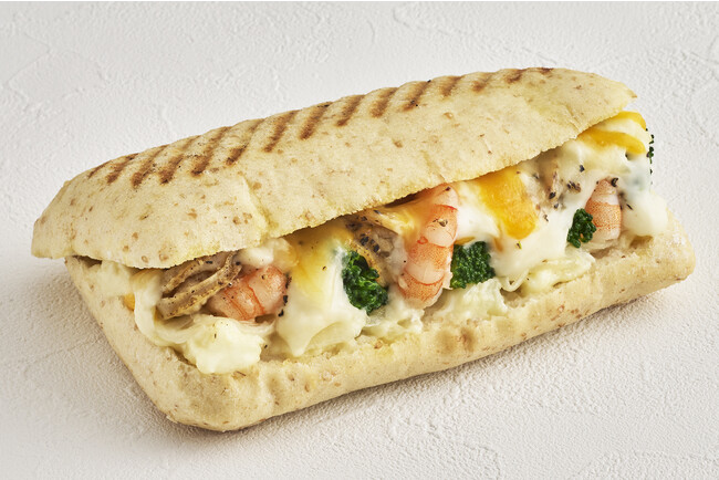 3.ベックスコーヒーショップ/北海道産ホタテと海老のグラタン風パニーニ/680円/使用海産物:帆立/北海道産の帆立と、海老を使用しホワイトソース(北海道産牛乳使用)とチーズを合わせたグラタン風のパニーニです。