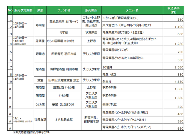 1.エキナカのそば店舗、カフェ、おむすび専門店、駅弁屋等で国産海産物を使った商品を約36万食販売(11月1日~6か月間)2.エキナカの寿司店等で青森県産帆立メニューフェアを実施(10月30日~1か月間)