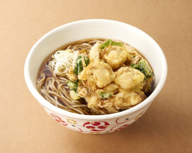4.いろり庵きらく等/青森県産帆立と長ねぎのかき揚げそば/640円/使用海産物:帆立/青森県産帆立を使用したかき揚げそば。長ねぎの甘みと帆立の旨みを楽しめる逸品。