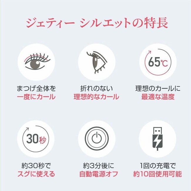 ジェティーシルエットは常に一定温度「65℃」をキープし、ヤケドの心配なしに、適切な温度でまつげ一本一本をカールします。温度を一定に保つことで一時的なカールではなく、持続力の長い理想的なカールが実現します。