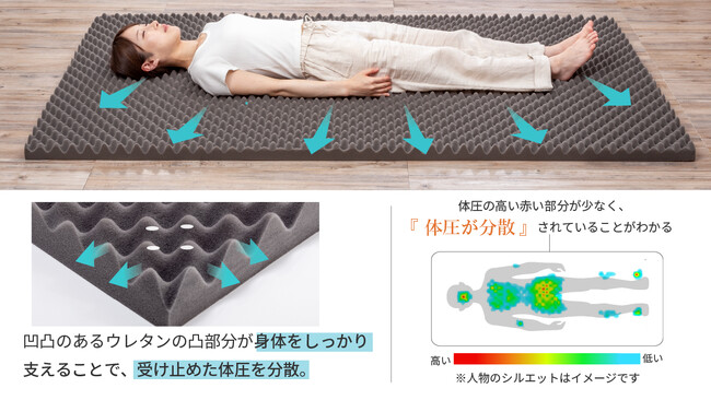 表面に「凹凸プロファイル加工」を施した高反発ウレタンが、過度な沈み込みを抑え、波型の頂点を中心に点で体を支え体圧を分散します。程よい硬さとしなやかな弾力で、体にかかる負荷を分散し、最適な寝姿勢をキープ。寝返りもスムーズに促します。