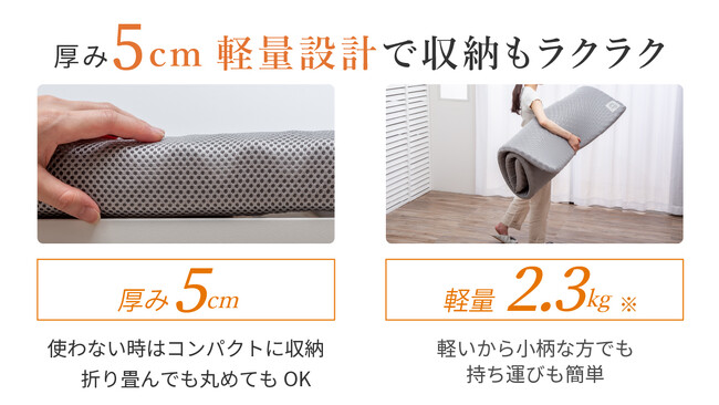 厚み10cm、重量3.9kg(シングルサイズの場合)の軽量設計で、コンパクトに収納が可能。