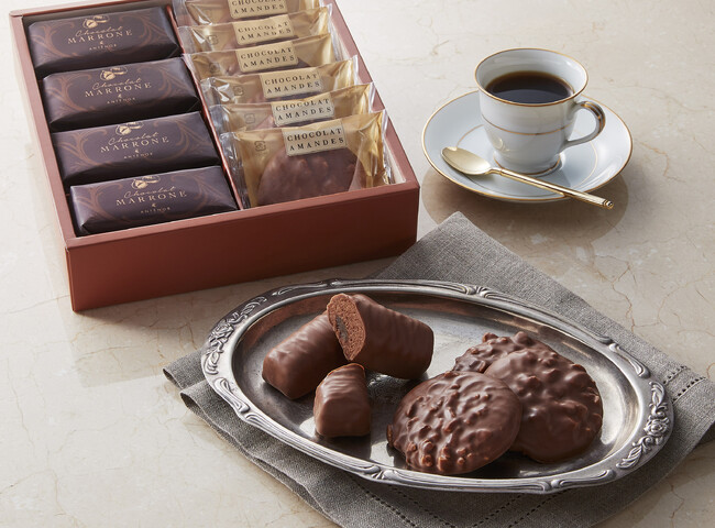 バニラを加えたブランデーに漬け込んだマロングラッセ入りのチョコレート生地を、ベルギー産チョコレートで包んだ「ショコラ・マローネ」、 カリッと香ばしいアーモンド入りのチョコレートクッキー「ショコラ・アマンド」に自慢の焼き菓子「レーズンサンド」「フィナンシェ」を詰め合わせた、季節限定詰め合わせ『ショコラガトー アソート』は全国店頭、オンラインショップにて販売中です。