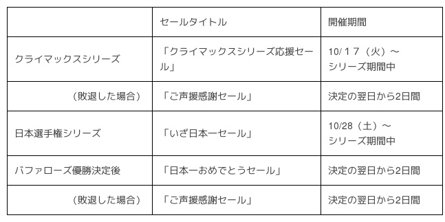 ※クライマックスシリーズまたは日本選手権シリーズにて惜しくも敗退した場合、「ご声援感謝セール」を予定。