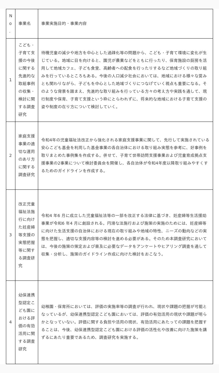 株式会社日本総合研究所(本社:東京都品川区、代表取締役社長:谷崎勝教、以下「日本総研」)は、こども家庭庁令和5年度子ども・子育て支援等推進調査研究事業の国庫補助の内示を受け、令和6年3月31日までの間、下記の4事業を実施します。