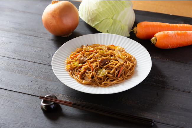 具材は国産のキャベツ、たまねぎ、にんじん、豚肉を使用。めんは、米のめんに“かんすい”を練りこむことで、コシのあるもちもち食感を味わうことができ、焼そば本来の風味に仕上げています。