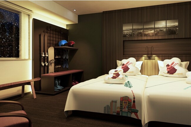 スキー板やブーツ、手袋などを置くスペースがあり、スキー後に快適に過ごすことができる客室です。更に、客室でもスキー旅行のわくわく感を感じられるように、スキーにちなんだアイテムを揃えました。アイテムは、札幌にも生息しているクマがスキーを楽しんでいるイラストのクッションやベッドカバーです。デザインには、スキーも街も一体となり、札幌でのスキー旅行を楽しんでほしいと の願いが込められています。