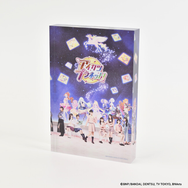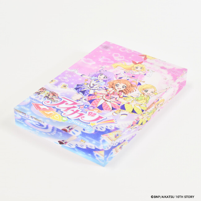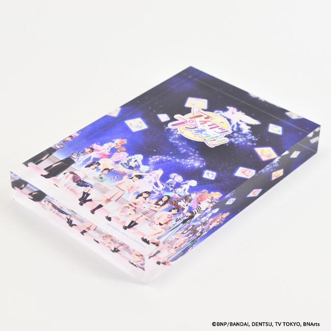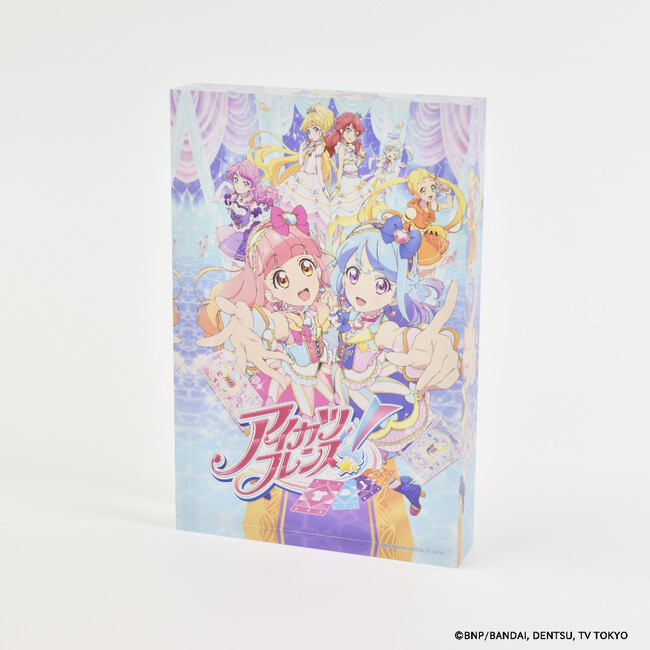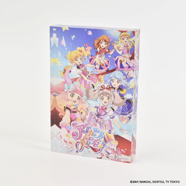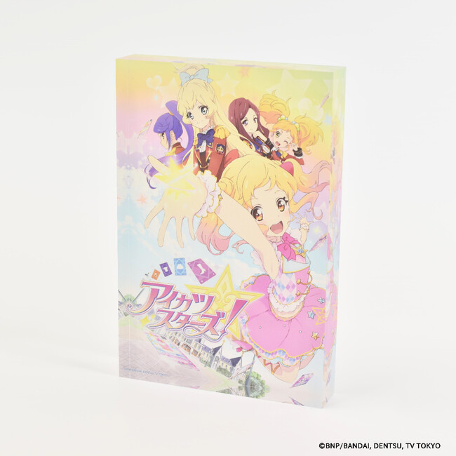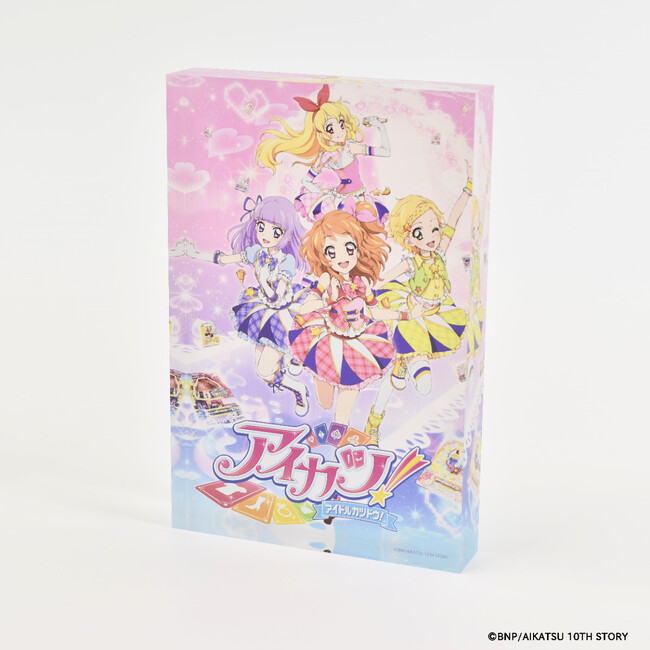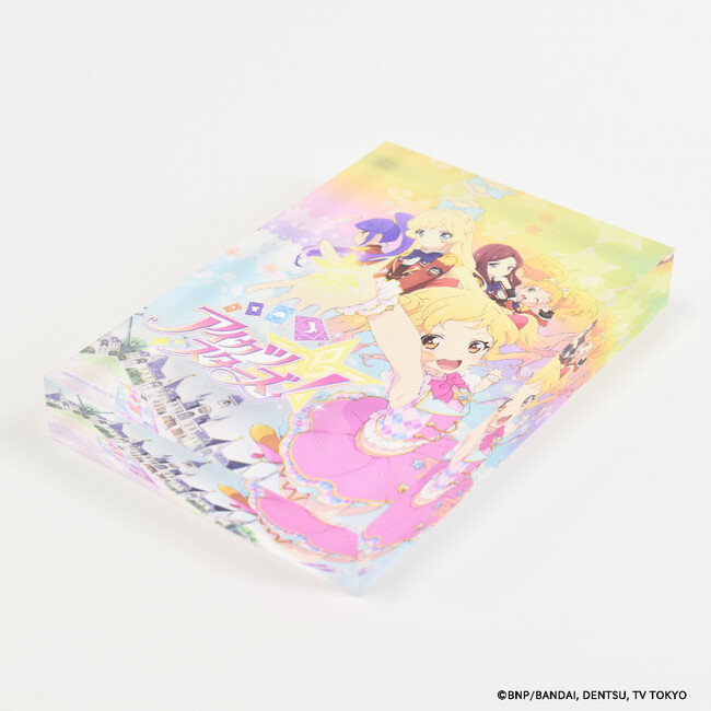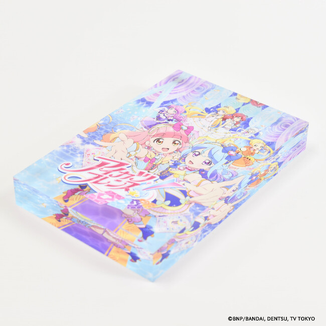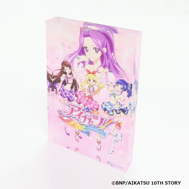 「アイカツ!シリーズ」のメモリーブロックには、歴代キービジュアルが重厚感あふれるアクリルブロックにとじ込められています。作品との思い出と同様、ずっと色あせることのない特別なプレミアムアイテムです。