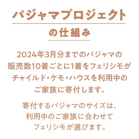 パジャマプロジェクトは、小児がんや難病などで長期療養中の子どもと、その家族を結ぶプロジェクトです。家族で一緒に眠る時間を大切に考え、病気と闘う子どもたちのために何かしたいという思いから発足。パジャマの販売枚数に応じて、兵庫県神戸市にある子どもと家族が一緒に過ごせる滞在施設「チャイルド・ケモ・ハウス」を利用中のご家族に、パジャマが寄付されます。