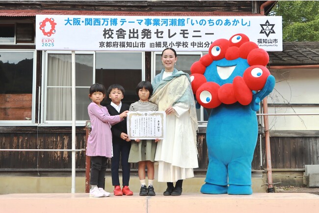 小学校の卒業生や元教師ら地元関係者を前に、福知山市長や大阪・関西万博テーマ事業プロデューサーの河瀬直美さんらがあいさつ。大阪・関西万博公式キャラクターの「ミャクミャク」が見守るなか、中出分校の通学区域に住む子どもたちから、感謝と期待を込めた校舎の「卒業証書」が河瀬プロデューサーに手渡されました。