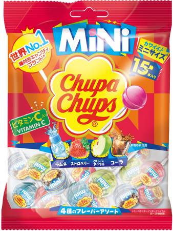 小さくてかわいい『チュッパチャプス ミニアソート』は、ミニ限定の「グリーンアップル」、「コーラ」、「ストロベリー」、「ラムネ」の4種類があわせて15個入ったアソートパックです。一粒の大きさが通常のチュッパチャプスの半分なので、短時間で食べきりやすく、子どもから大人までちょっとした隙間時間に食べたり、その時の気分に合わせてお好みのフレーバーを選んだり、友達とシェアしたりと様々な場面で「チュッパチャプス」をお楽しみいただける商品です。