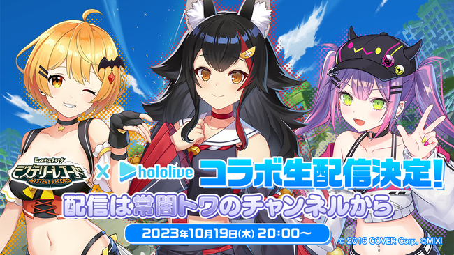 株式会社MIXI(東京都渋谷区、代表取締役社長CEO:木村 弘毅)が提供する、モンストシリーズとなるスマホアプリのひらめきアドベンチャー「ミステリーレコード」(以下ミリコド)は、ハーフアニバーサリー記念コラボの第2弾として、VTuberグループ「ホロライブ」との初コラボを2023年10月26日(木)18:00から開催します。