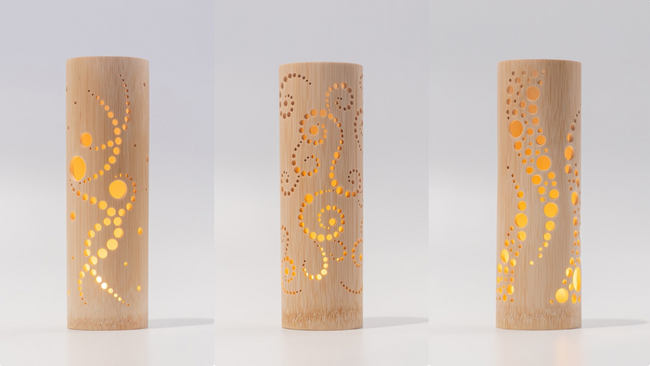 竹に細かなデザインをほどこし、ロウソクや LEDライトで明かりを灯す「竹あかり」
