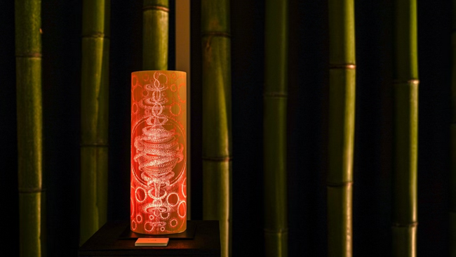 放置林から切り出した竹に細かなデザインをほどこし、ロウソクや LEDライトで明かりを灯す「竹あかり」。三重県の工房で職人が一点ずつ手づくりしています。