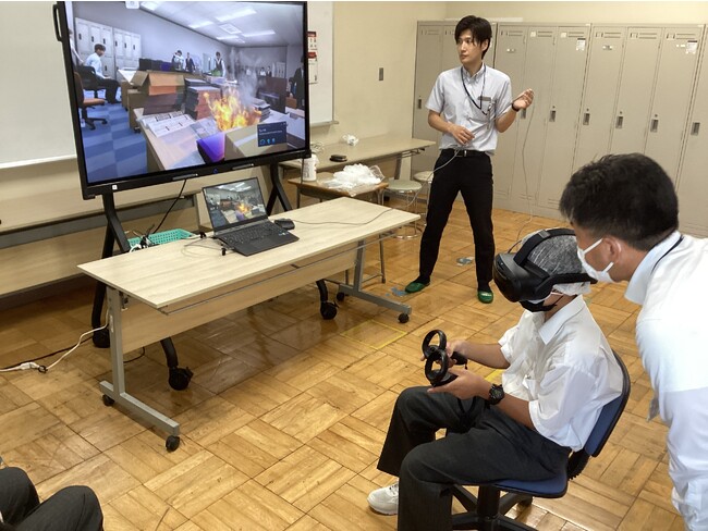 また、同日午後には、高等部の生徒8名を対象にして、VRを活用した防災教育プログラムを実施。同校では、昨年度も同プログラムを実施しましたが、避難行動をより実感を持って考えるきっかけをVR体験から得られたことから、本年も継続して実施することになりました。