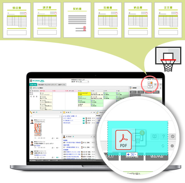 そこで、NIコンサルティングでは、経営改革型グループウェア『NI Collabo 360』に、電子ファイルをドラッグ&ドロップするだけでAI-OCRが解析して最適な機能に自動で振り分ける新機能「バスケット」を追加した新バージョンを提供開始します。