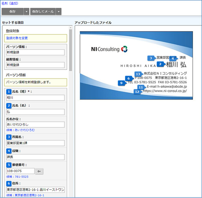 「バスケット」は名刺のデジタル化にも対応しています。専用のスマートフォンアプリで名刺を撮影すると会社名や連絡先をテキスト化し、さらに法人番号やホームページから情報を補足。NIコンサルティングの提供する営業支援システム『Sales Force Assistant』やマーケティング支援システム『Approach DAM』にそのまま転送し、顧客情報データベースとして登録することができます。
