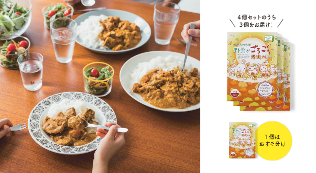 フェリシモが展開する「おてらぶ(TM)」は、「みんなのやさしさおすそ分け お坊さんとつくった野菜がごろごろ精進カレー」のウェブ販売を10月16日より開始しています。おいしいカレーを味わいながら、同時に困っている誰かを笑顔にできる社会支援付きのレトルトカレーです。4個セットになったレトルトのカレーを購入すると、うち1個が「おてらおやつクラブ」を通じて、さまざまな事情で困りごとを抱える全国のひとり親家庭に配送されます。しあわせな一家団らんを象徴する、みんな大好きな日常のごちそうカレーライス。しかし、さまざまな事情により日々の食事すらままならない家庭もあるというあまり知られていない日本の貧困の現状を知ってもらい、少しでもよくするきっかけになればと、「おてらぶ」に縁のあるカレー好きたちが集まって誕生した“やさしさのおすそ分け”プロジェクトです。社会支援はもちろん、大きな野菜がごろっと入っているスパイスの効いた本格派のカレーは、大人も子どもも大満足なおいしさに仕上がっています。こよなくカレーを愛するメンバーならではの多彩なアイデアがぎゅっと詰まった食べごたえもたっぷりなレトルト精進カレーです。
