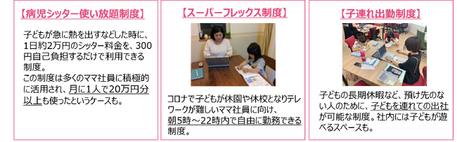 さらに超効率化による“長時間労働の廃止”と、子育てをしながら働くママを支える独自の福利厚生で、育休・産休からの復職率は100%となっています。2013年、2016年には「東京ライフ・ワーク・バランス」認定企業としても表彰を受けています。