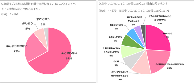 「渋谷や六本木など屋外や街中でのハロウィンイベントに参加したいと思いますか?」と質問したところ、「全く思わない」と回答した人が全体の67%で半数以上となり、街中でのハロウィンの参加を控えるよう呼びかける一方で、参加したいと思っている人は意外にも少ないことがわかりました。また、参加したくない理由としては「人が多いから」が1位という結果に。