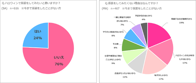 今までハロウィンで仮装をしたことがない人に「ハロウィンで仮装をしてみたいと思いますか?」と質問をしたところ、7割以上が「仮装をしたくない」と回答し、ハロウィン仮装に対して消極的という結果に。その理由としては、「準備するのが面倒だから」の回答が約2割という結果になりました。また、仮装のみならず「ハロウィン文化が好きじゃないから」が17%と、ハロウィン自体を好ましく思わない人も一定数いることがわかりました。