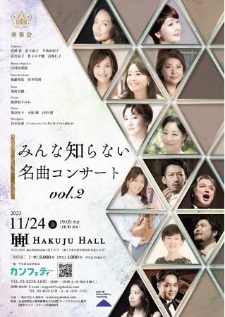 一般社団法人 奏楽会(東京都千代田区、代表:三浦義孝)主催、『みんな知らない名曲コンサート Vol.2』が2023年11月24日 (金)にHakuju Hall(東京都渋谷区富ヶ谷1-37-5(株)白寿生科学研究所本社ビル 7F)にて開催されます。