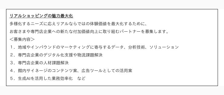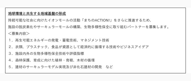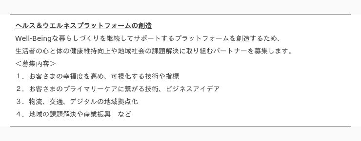 ディベロッパー事業を手がけるグループ中核企業が3つの募集テーマ「ヘルス&ウエルネスプラットフォームの創造」「リアルショッピングの魅力最大化」「地球環境と共生する地域基盤の形成」にて共創パートナーを募集