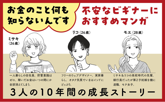 本書の主人公は26歳のミサキさんと、友人2人の仲良し3人組。彼女たちの10年間の成長を追いかけながら、お金との向き合い方を学べます。