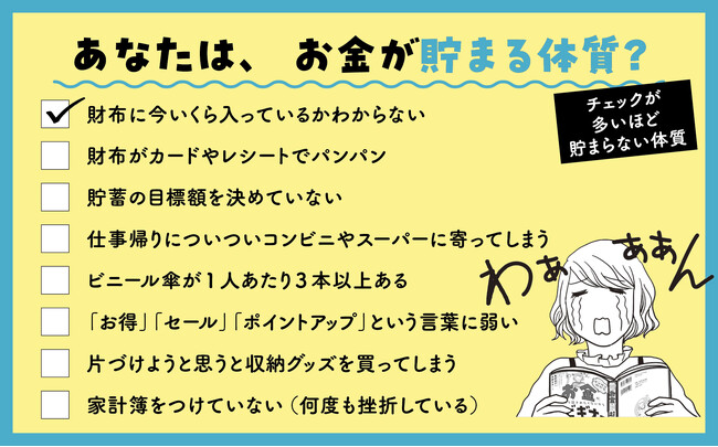 20代モニターからは「これって、私のこと?」「俺のこと?」と共感の声が。まずはチェックシートでお金が貯まる体質か確認しましょう。