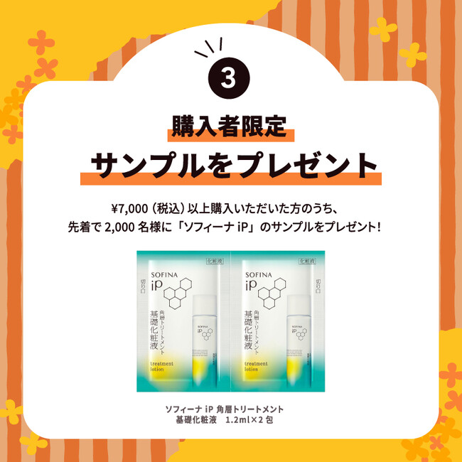 『LIPSショッピング』での「ソフィーナ iP」取扱い開始を記念したプレゼントをご用意。7,000円(税込)以上の購入で、合計2,000名様に「ソフィーナ iP 角層トリートメント 基礎化粧液」のサンプルをプレゼントいたします。