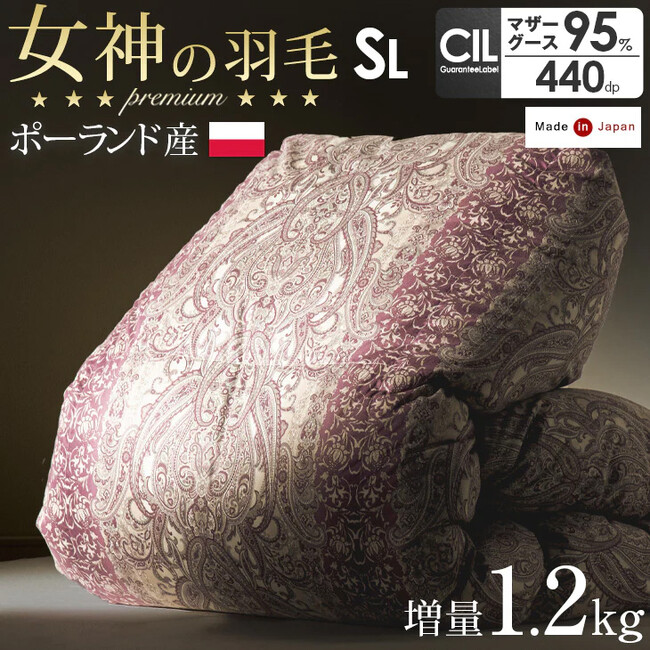 ポーランド産のマザーグースダウンを95%使用した羽毛布団です。こちらは最高品質のCILプラチナラベルを取得したダウンパワー484dp以上を誇る羽毛を使用しています。