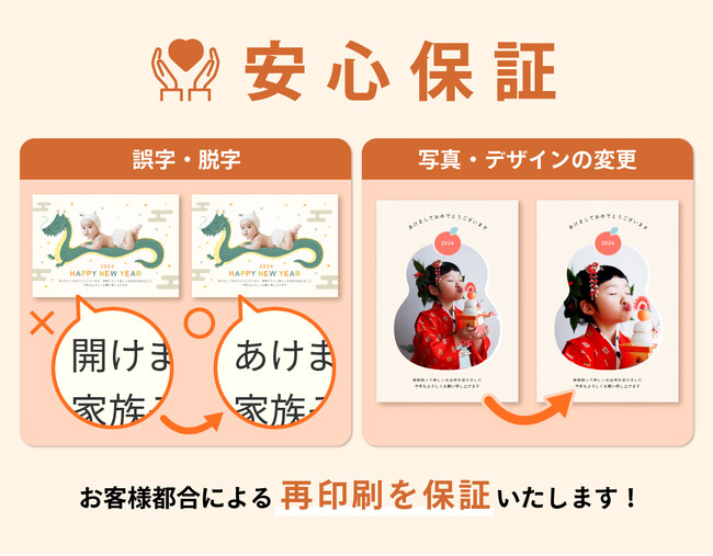 誤字や脱字の修正、デザイン変更など、お客様のご都合による再印刷を保証します。