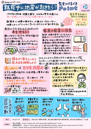 千葉大学発医療スタートアップ企業である株式会社Smart119(本社:千葉県千葉市、代表取締役社長/CEO:中田孝明)は、地震が就寝中に発生した時の対応についてのイラストレーションを、本日一般公開しました。2004年10月23日に新潟県中越地震が発生しました。いつ起こるかわからない地震では、発生後の対応で生死を分けることがあります。特に、就寝中では、状況を把握するのが難しく、ましてや夜間の暗闇の中では手探り状態になりかねません。「あわてず、落ちついて」行動するために、事前に心掛けていたいものです。救急集中治療医と救急救命士の見地から、就寝中に地震が発生した時に気をつけるべきポイントを、親しみやすいマンガで解説します。本資料は学校、企業、公共機関、町内会等で自由に配布・利用していただくことが可能です。