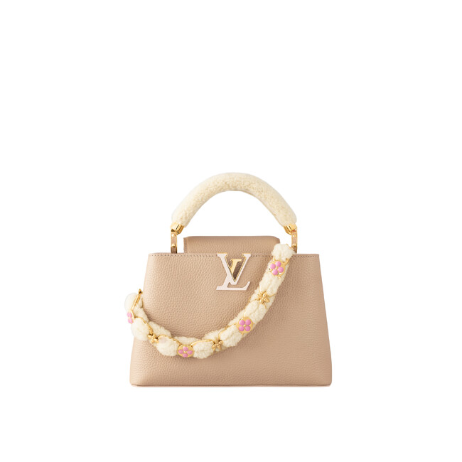 トリヨンレザーで仕立て、肌触りの良いシアリングのハンドルで冬らしくアップデートした「カプシーヌ BB」。取外し可能な装飾的なチェーンにもシアリングを編み込み、エナメルとゴールドカラーのメタルで表現したモノグラム・フラワー モチーフで彩りを添えました。取外し & 調節可能な細いストラップ付き。