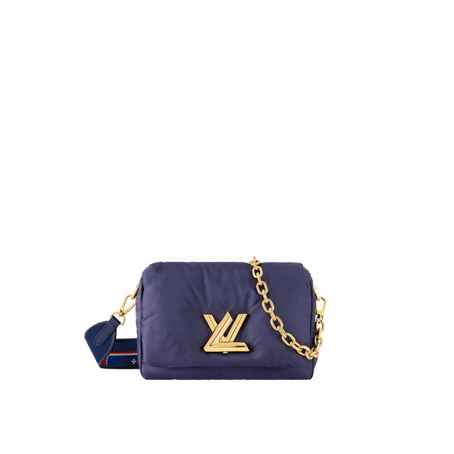 スキーウェアから着想を得た「ツイスト MM」。リサイクルされたナイロン素材であるECONYL(R)100%で仕立て、パッド加工を施して、非常に軽量かつボディフレンドリーなデザインに仕上げました。フィリングにもリサイクル素材を使用。片面にモノグラム・フラワー スキー パターンを、もう片面にスポーティなスノーフレークを模った「Vuitton」シグネチャーを織り込んだストラップを備えています。