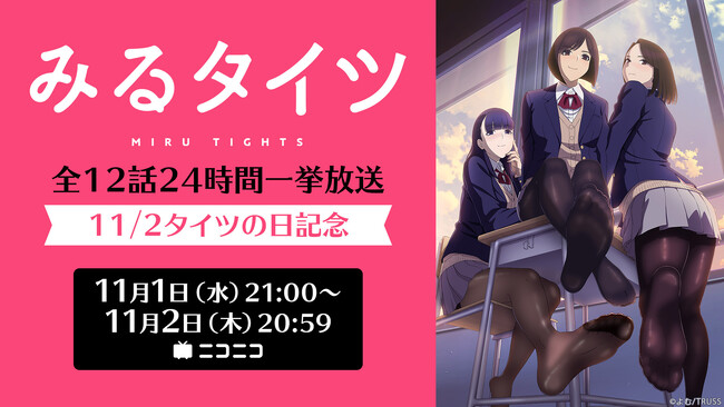 株式会社ドワンゴは、ライブ配信サービス「ニコニコ生放送」にて、2023年11月2日(木)の“タイツの日”を記念し、ショートアニメシリーズ『みるタイツ』の全12話を2023年11月1日(水)21時より24時間にわたり繰り返してお送りする無料一挙放送を実施します。