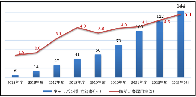 法定雇用率2.3%に対し、障がい者雇用率5.1%(2023年9月時点)