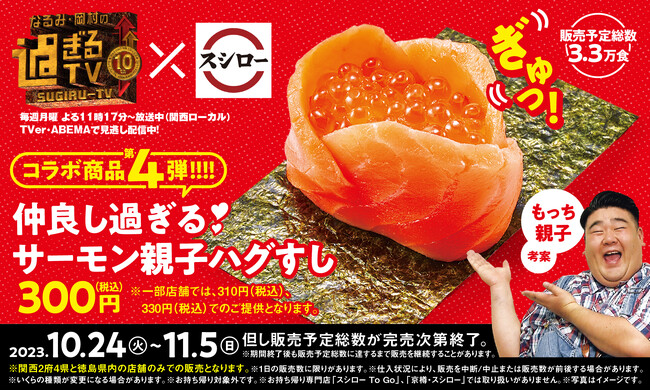 株式会社あきんどスシロー(本社:大阪府吹田市、代表取締役社長:新居 耕平)は、朝日放送テレビ“なるみ・岡村の過ぎるTV”とコラボし、「仲良し過ぎるサーモン親子ハグすし」を、10月24日(火)より、関西2府4県と徳島県のスシローにて期間限定で販売いたします。