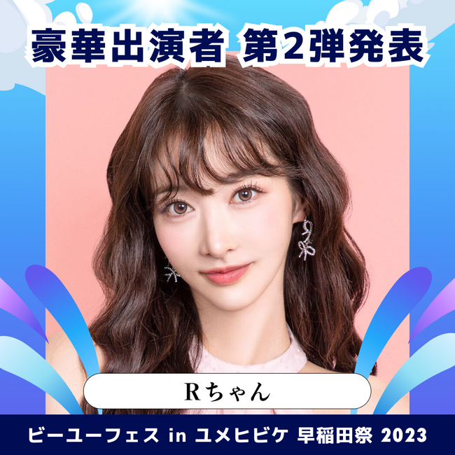 株式会社Cinderelax(本社:東京都新宿区、CEO:小池伶佳)は早稲田大学の文化祭「早稲田祭」において、ファッションショーやトークイベントを中心とした「ビーユーフェス」を11月4・5日に開催する。同イベントに参加する第2段の有名タレントとしてRちゃんを発表。以前に発表された板野友美・ローランド・景井ひなを含め、4名の豪華タレントがビーユーフェスへ出演する。