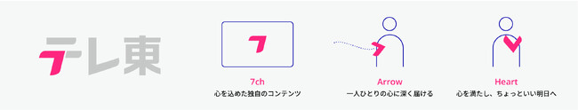 「テ」の左下の赤い部分は、数字の「7(テレビ東京のチャンネルは7)」をモチーフにした矢で、テレビ東京の想いを乗せて一人ひとりの心に深く届き、「ちょっといい明日」を提供していくことを表現しています。