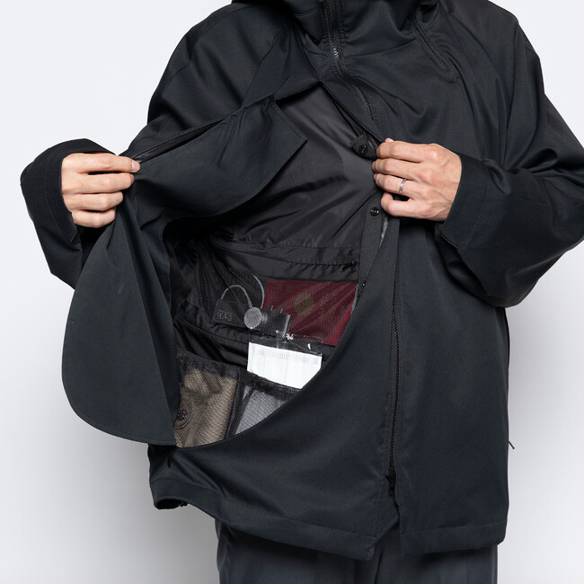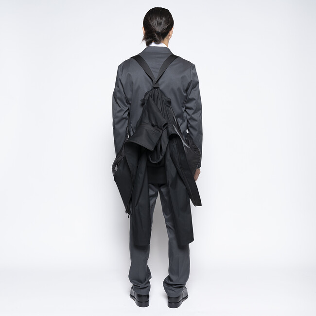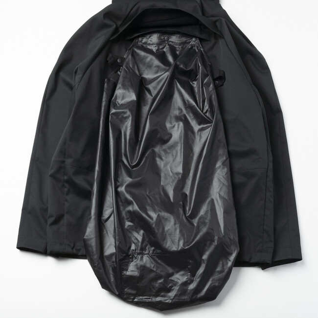 本商品は、独自開発の新素材「ultimex」により軽量かつ簡単に丸洗いでき、撥水性と速乾性に優れた高機能性を実現しました。右前身頃を覆うように作られた大きい隠しポケットの内側には、500mlのペットボトルが収納できるペットボトルホルダーや、中身が見えるメッシュポケットを搭載しております。アウターには大小異なる計13個のポケットがあり、バックを持たずに全ての荷物を持ち運ぶことができます。加えて、脱いでも背負うことが可能なショルダーストラップを付けることで荷物が多くても手ぶらで行動できる仕様にしました。ビジネスマンが抱えるアウター問題全てを解決する商品となっております。