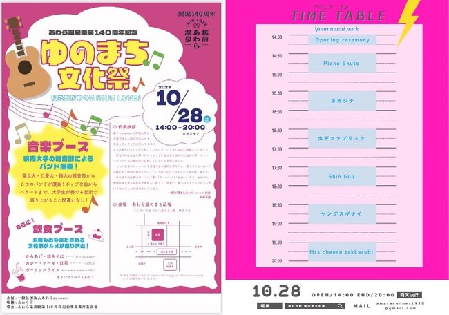 令和5年10月28日(土)、あわら温泉湯のまち広場で、一般社団法人あわらConnectが、地元福井県と隣県の大学生たちが作り上げる音楽ライブとグルメのイベント「ゆのまち文化祭」を開催します。