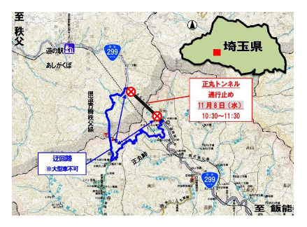 一般国道299号正丸トンネルは、10時30分から11時30分までの間、通行止めとなります。普通車は県道青梅秩父線、飯能市道により迂回することができます。大型車は迂回路がないため、他のルートをご利用いただくか、訓練終了まで待機をお願いします。