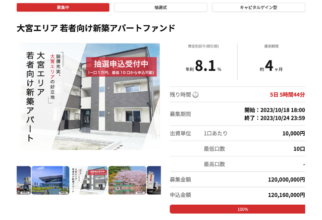 ヤマワケエステートの第2号不動産ファンド「大宮エリア 若者向け新築アパートファンド」が開始後約24時間で目標金額達成。募集終了時点の申込総額は2億5,486万円。